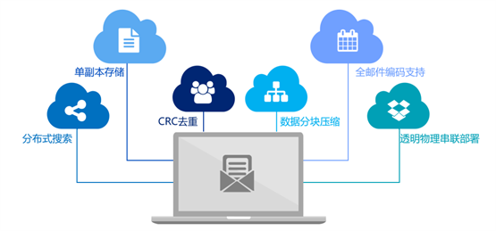 Coremail邮件归档模块采用分布式搜索的方式,通过单副本存储、CRC去重、透明物理串联部署等先进技术,实现了数据的高效归档。