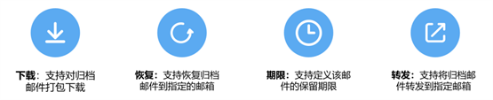 Coremail邮件归档模块支持将系统备份的历史邮件一键还原,包括对归档邮件打包下载、恢复邮件到指定邮箱、定义邮件的保留期限、将归档邮件转发到指定邮箱等多种操作方式,保障资料交接不断档,业务连续不影响。